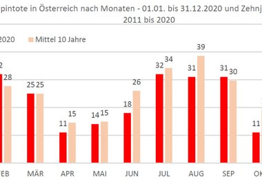 Zumeist ist die Anzahl der Alpintoten im Juli, August und September am höchsten, so auch im Jahr 2020. In unfallreichen Wintern kann es aber auch zu einer Verschiebung in die Monate Februar bzw. März kommen, so im Jahr 2020 mit 32 Alpintoten im Februar.