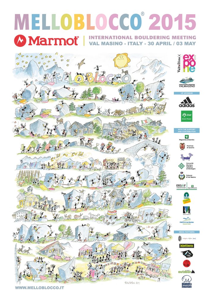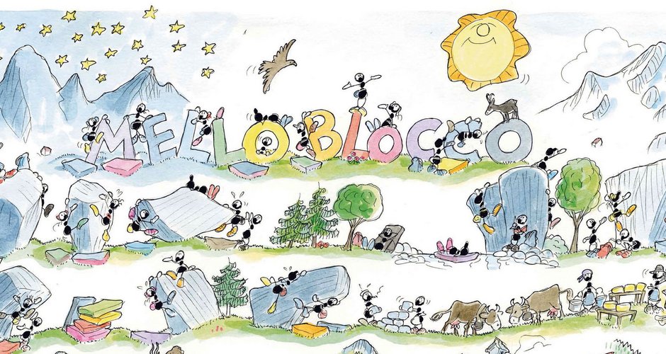 For a special, universal edition, a special poster is needed. And so Melloblocco 2015 has been designed by Italian artist Fabio Vettori who, with his famous ants, provides one of the most poetic and authentic images not only of the Valley but also of the Melloblocco spirit. “A quick glance suffices to capture the sky of this granite valley and Mt Cavalcorto, opposite the Monte Disgrazia” writes Michele Comi, along with Nicola Noè and Stefano Scetti the organiser of the event on behalf of the Valmasino Tourist Board. “The motley colored Melloblockers and a swirl of rocks intertwine with the stone houses at Cascina Piana, the Filorera bridge, the thermal baths at Bagni di Masino and the countless boulders scattered throughout the valley, meadows and forests. And then there’s the Melloblocco village, the stonemasons, “camer” (rural dwellings below the rocks), champions, amateurs, enthusiasts, those who are simply curious to see what it’s all about, animals, fir trees, beech, musicians and cheesemakers.. ” It goes without saying that Fabio Vettori’s drawings and his ants will accompany Melloblocco 2015 with an exhibition of his art works, along with that of Massimo Malpezzi who through 10 photographs will summarise the art of climbing while Popi Miotti, with his “Mello-mite” produced together with the Lombardy ERSAF, will provide a striking comparison between Val di Mello’s unmissable Nature Reserve and Yosemite Valley.