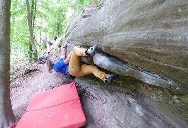 Michael erkannte rasch, dass es noch ein sehr langer Weg sein wird, bis er seine ersten Gehversuche machen konnte. „Ich erinnerte mich daran zurück, als meine Profikarriere als Kletterer begann und als nur der „Eiserne Wille“ zählte. So kämpfte er sich Stück für Stück nach vorne. Seine Krankengymnasten nannten ihn nur noch eine „Kämpfersau“. Es sollte aber weitere 10 Jahre dauern, bis Michael dem das Versorgungsamt eine 90% Schwerbehinderung attestierte, das erste Mal wieder einen Felsen berührte. Auf einer Wanderung auf den Berg Lusen im Bayrischen Wald sah er am Parkplatz eine künstliche Kletterwand. Seine Freundin sagte: „Versuche es doch mal…, komm auf!“ Erstmals seit 2003 hielt sich Michael wieder an einem Griff fest. Es hatte Spaß gemacht und Michael spielte mit dem Gedanken, nochmals mit dem Klettern anzufangen. Nach etlichen Absprachen mit seinen Ärzten bekam er das Okay, aber nur unter der Voraussetzung, starke Überhänge zu meiden und eine Bandage zu tragen. „Ich machte mich auf die Suche nach einer geeigneten Bandage für meinen Bauch. Aber auch das Stoma musste geschützt werden, da ja genau über dieses der Klettergurt läuft. Schließlich fand ich eine Firma, welche genau solche Bandagen herstellt. Nun stand einem Neustart meiner Kletterkarriere nichts mehr im Wege.“