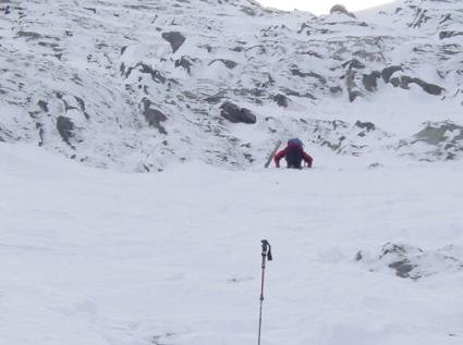 Zum ersten Mal erkannten wir den Vorteil, der sich ergibt, wenn man die Wand zuerst hochklettert bevor man sie hinunter fährt. Man ist die Steilheit bereits gewöhnt und kennt auch die Bedingungen viel besser. Vorausgesetzt man fährt dann auch dort hinunter wo man hoch gegangen ist.