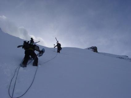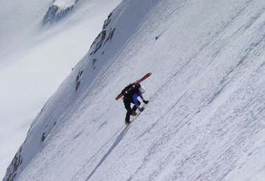 Am Eispickel gesichert ziehe ich die Ski und Max das Snowboard an.. Knappe 500 Meter zieht die Wand hinunter und verliert sich in der abschließenden Felsrinne. Die Spannung steigt. Die Polen nehmen Stellung ein und zücken ihre Fotoapparate. Plötzlich schwindet jede Müdigkeit, auch die Anstrengungen und Krämpfe von gestern sind vergessen. Ich pack den Pickel ein, atme tief durch, ein Blick zu Max und raus aus der Startrampe.