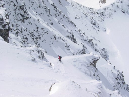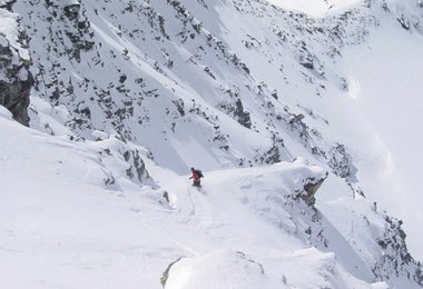 Plötzlich sehe ich, wie Hansjörg aus der Rinne weiter hinaus in die Felswand quert. „Da spring ich nicht runter“ ... der Mut hat ihn verlassen. Er bevorzugt eine Querung in das felsige Gelände, um dort mit den Skiern absteigen zu können. Aber schneller als er glaubt „bockt“ es ihm die Skispitzen hinten und vorne auf und er steht mit den Kanten im 60 bis 65 Grad steilen Gelände. No way out!