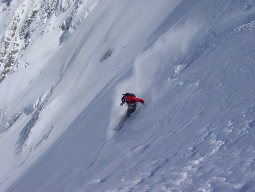 Unsere Steilwand - Kollegen aus dem Norden kamen aus dem Staunen nicht mehr heraus. Auch sie waren gute Skifahrer, aber so etwas und dann auch noch mit Snowboard hatten sie noch nie gesehen. Ich schloss zu Max auf, der in der Mitte auf mich wartete und übergab ihm die Kamera. Es war an der Zeit Gas zu geben, denn die ersten Steine kollerten bereits die Rinne runter.