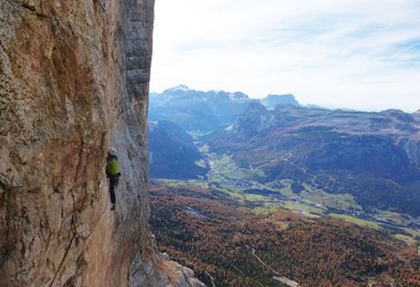 Am Ende des Tages und am Ende dieser Suche nach Antworten steht die neue „Oblinger-Variante“ am Mittelpfeiler des Heiligkreuzkofel. Als Schwierigkeitsbewertung für diesen Quergang schlagen wir den VIII. Grad vor. Die Originalführe führt in dieser 3. SL vom Stand ein paar Meter nach oben, quert dann waagrecht nach rechts bis zu einem Haken. An diesem Haken erfolgt üblicherweise ein gegenseitiges Ablassen um 6-7 m nach unten. Derzeit (Oktober 2017) befinden sich übrigens überall diverse alte Fixseile in diesem Bereich (nicht nur auf den 6-7 vertikalen Metern). Nach dem Ablassen wird auf einer Art Steilplatten-Rampe in wieder grauem Fels weiter nach rechts gequert. Die nun neue „Oblinger-Variante“ stellt die eigentlich logische Linie in diesem Wandbereich dar, denn sie ist die natürliche Fortsetzung der eben erwähnten Steilplatten-Rampe nach Links. Vom Stand vor der 3. SL führt die neue Variante nun nicht nach oben wie die Originalführe sondern zunächst 1 m nach unten (ca. III. Schwierigkeitsgrad) und quert dann umgehend waagrecht nach rechts ins gnadenlos exponierte leicht überhängende Gelände hinaus. Zunächst geht es echt super und es gibt erstaunlich gute Griffe (max. VII+). Doch nicht zu früh freuen. Das dicke Ende und die VIII er Züge kommen zum Schluss, kurz bevor man wieder auf die Fixseile der Originalführe trifft. Zwei Normalhaken (belassen) und drei Friends dienten der Absicherung.