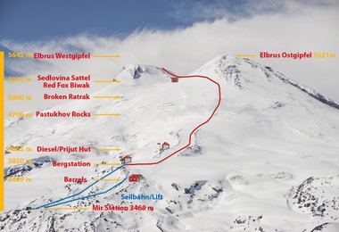 Der Elbrus ist mit 5642 m Höhe der höchste Berg des Kaukasus und Russlands und gilt nach den Listen von Bass und Messner als höchster Berg Europas womit er zu den Seven Summits zählt. Der Elbrus ist ein erloschener Vulkan mit einem Doppelgipfel (Westgipfel Höhe 5642 m, Ostgipfel Höhe 5621 m), die etwa 1,5 km voneinander entfernt sind. Der letzte Ausbruch fand vor zirka 2.000 Jahren statt und noch heute weisen Thermalquellen in Gipfelnähe auf seine vulkanische Vergangenheit hin.