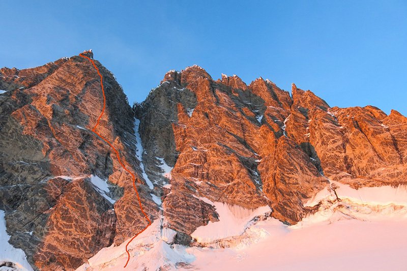 Die Route wurde bereits 2011 bis auf die letzten zwei Seillängen von Tony Richardson und Jason Kruk geklettert. Kurz vor dem Gipfel mussten die beiden allerdings wegen extrem schwieriger Eisbedingungen aufgeben. Die nun vollstängig gekletterte Tour weist Schwierigkeiten bis 5.11, WI 3, ED1 auf.