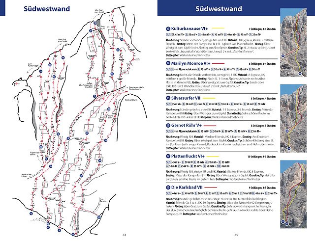 Die Alpinklettertouren in den Felswänden der großen Kletterberge wie Roter Turm, Große und Kleine Laserzwand, Kleine Gamswiesenspitze, Törlspitz, Simonskopf, Teplitzer Spitze, Seekofel und dem Hochstadel mit der dritthöchsten Nordwand der Ostalpen sind mit Topozeichnungen, Übersichtsfotos, ausführlichen Routeninformationen sowie teilweise mit atemberaubenden Kletterfotos beschrieben bzw. erklärt.