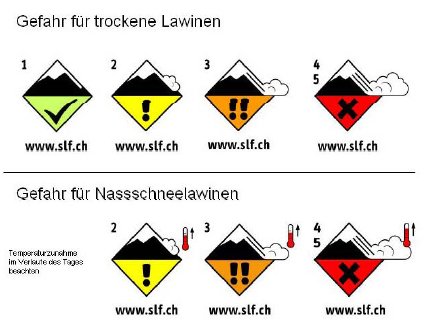 Die Icons richten sich an alle interessierten Schneesportlerinnen und Schneesportler, vor allem aber an Personen ohne spezielle Schnee- und Lawinenkenntnisse. Sie sollen es auch den Medien ermöglichen, mit eingängigen Bildern auf die Lawinengefahr aufmerksam zu machen. Das SLF veröffentlicht ab sofort jeden Tag zusätzlich zur bestehenden Gefahrenkarte mit ausführlicher Textinformation eine vereinfachte Übersicht über die Lawinengefahr in Form von Icons.