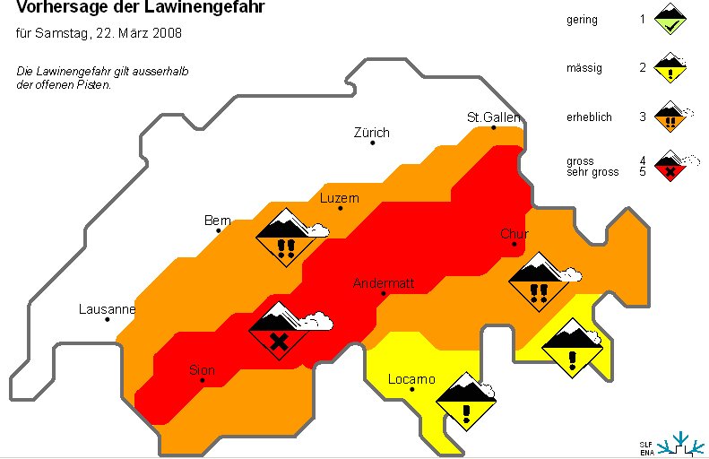 Die Karte mit den Icons wird auf der SLF–Website sowie in verschiedenen Print- und Online-Medien publiziert. Die vereinfachte Darstellung macht die Lawinengefahrenstufen mit bildlichen Handlungsempfehlung besonders für Laien besser zugänglich. Ziel ist es, mit der täglichen Veröffentlichung der Icons in den Medien zu einer allgemeinen Sensibilisierung für die Lawinengefahr beizutragen.