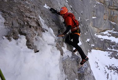 Schwierigkeiten: Fels bis V+; Eisfelder 50-55°. Fels meist ungünstig geschichtet und stellenweise brüchig. Die Route gehört immer noch zu den anspruchsvollsten alpinen Klettereien in den Alpen.