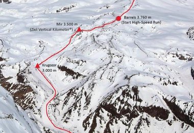 Die Königsdisziplin ist der SkyMarathon®, er führt von Azau über 12,2 km und 3283 Hm hinauf zum Westgipfel des Mount Elbrus auf 5642 m. Die Strecke verläuft bis auf 3700 m entlang der Piste, folgt dann der teils vergletscherten Südflanke in den Sattel auf 5358 m und quert zuletzt den steilen Osthang des Westgipfels bis zum höchsten Punkt Europas. Der Lauf ist abgesehen vom Umstand, dass er immer über Schnee und Eis führt - ab 4600 m ist in der Regel Steigeisenpflicht - technisch nicht schwierig. Man befindet sich aber trotz der Fahnenmarkierung und der vier Streckenposten immer in extrem alpinen Gelände und hat oft mit launischem Wetter zu kämpfen, das in der Höhe schnell umschlagen kann. Die Temperaturen erreichen Anfang Mai auf dem Gipfel kaum mehr als -20 Grad, oft sind die Temperaturen aber deutlich tiefer und der Windchillfaktor klopft bei Sturm auch schon mal an die -35° an. Red Fox hatte bei den bisherigen Veranstaltungen aber immer großes Wetterglück und die Renndistanz musste erst einmal bis zum Sattel (5358 m) verkürzt werden.