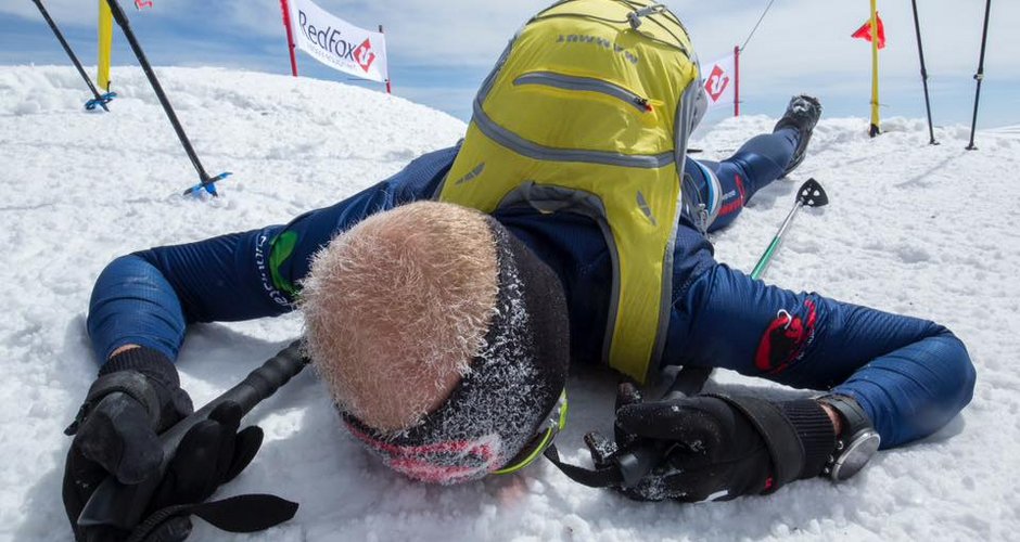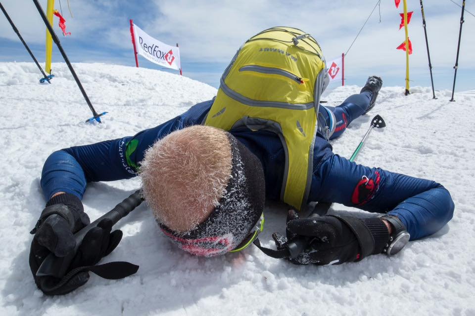 Karl Egloff völlig ausgelaugt am Gipfel des Mount Elbrus (c) RedFox Elbrus Race/Oleg Chegodaev , 5642 m