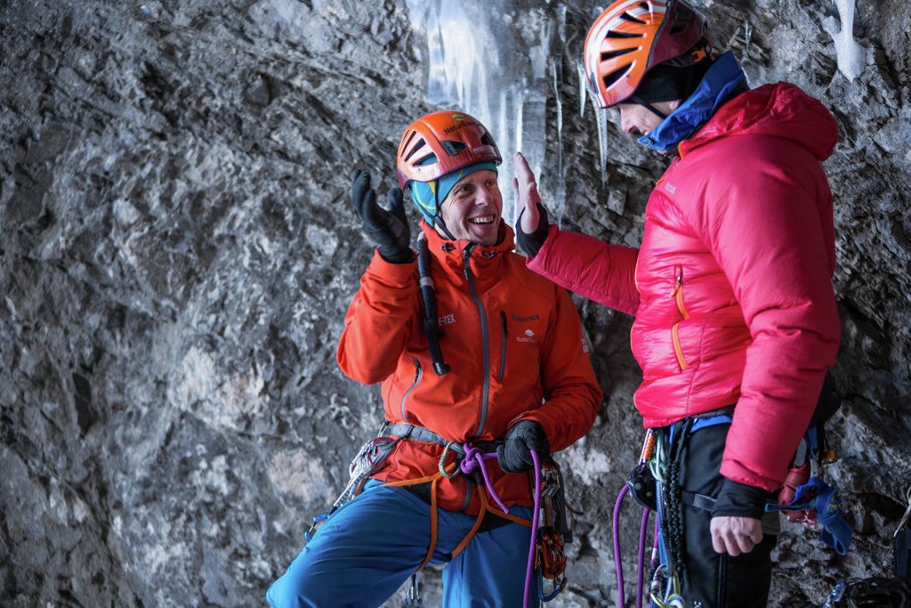 Dank der tollen Unterstützung meiner Kletterfreunde, konnte ich zwei Tage später einen weiteren Versuch mit meinem Bergführerkollegen Rainer starten. Mittlerweile verbuchte ich die erste Seillänge unter „Warm up“, wie sich die Einstellung ändert! Diesmal, mit wieder viel Adrenalin im Blut, ließ ich in der Schüsselseillänge keine Fehler mehr zu und wie programmiert spulte ich Zug für Zug ab. Ich fühlte mich wie in Trance, alles um mich herum verschwandt, der perfekte Moment! Danach die M9, dann eine WI5, es war geschafft! Als wir den Ausstieg erreichten dämmert es bereits. Mit einem „ritterlichen“ Gipfelhandschlag krönen wir die gelungene Begehung.