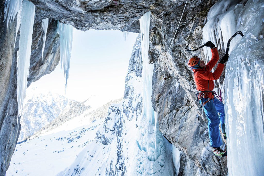 Schon seit längerer Zeit war mir die direkte Linie durch diese riesige Grotte, gespickt von grossen Eiszapfen aufgefallen. Ich hatte vor über 10 Jahren eine erste Seillänge an fragilen Damoklesschwertern aus Eis und im brüchigen Fels eröffnet (M9), brach dann aber unter dem horizontalen Riesendach mental ausgebrannt ab. Meine persönliche Vorgabe ohne Bohrhaken im Trad-Stil da hinauf zu kommen ließ mir einen „kalten Schauer“ den Rücken hinunter laufen.