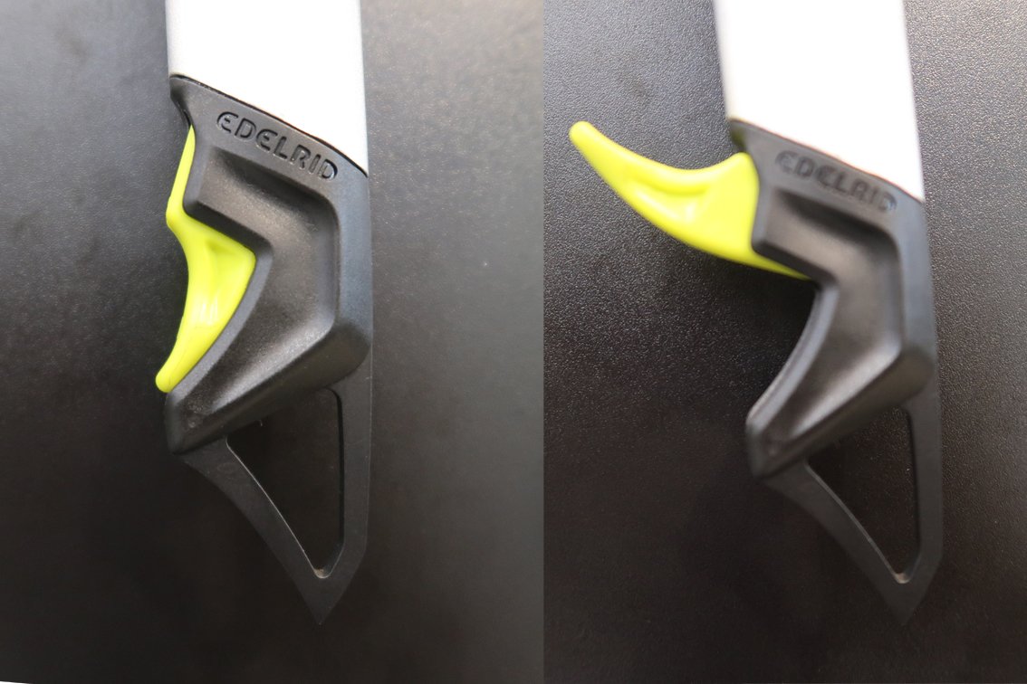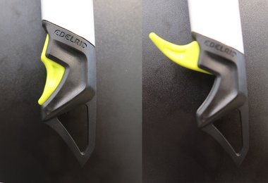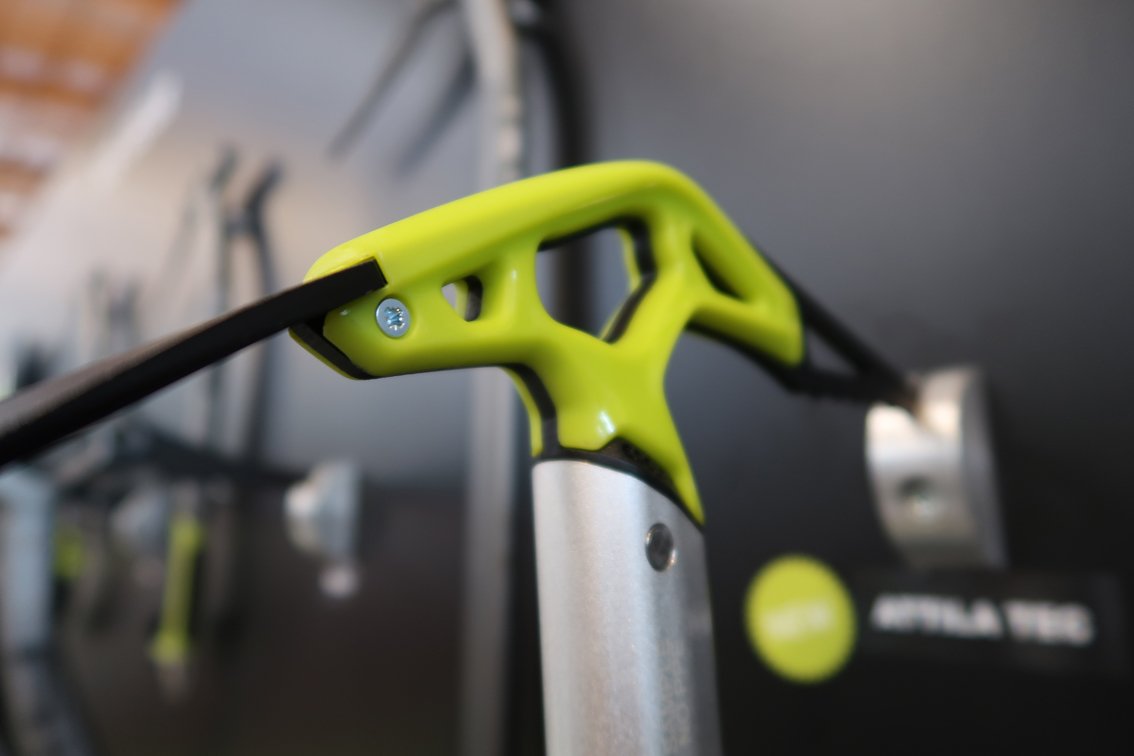 Pickel mit Griffklappe: Originell ist auch der Attila Tec Pickel mit der einklappbaren Griffklappe und dem Kunststoffgriff bei der Haue. So kann man diesen Pickel schnell im steileren Gelände zum Hauen umbauen, bei der normalen Anwendung als Gehpickel wird die Kälte durch den Kunststoffgriff nicht zum Handschuh weitergeleitet.