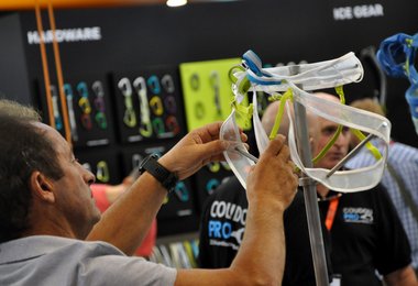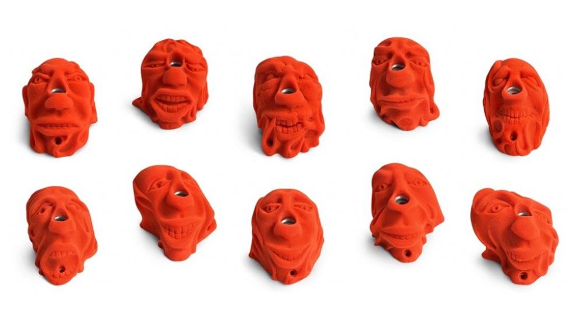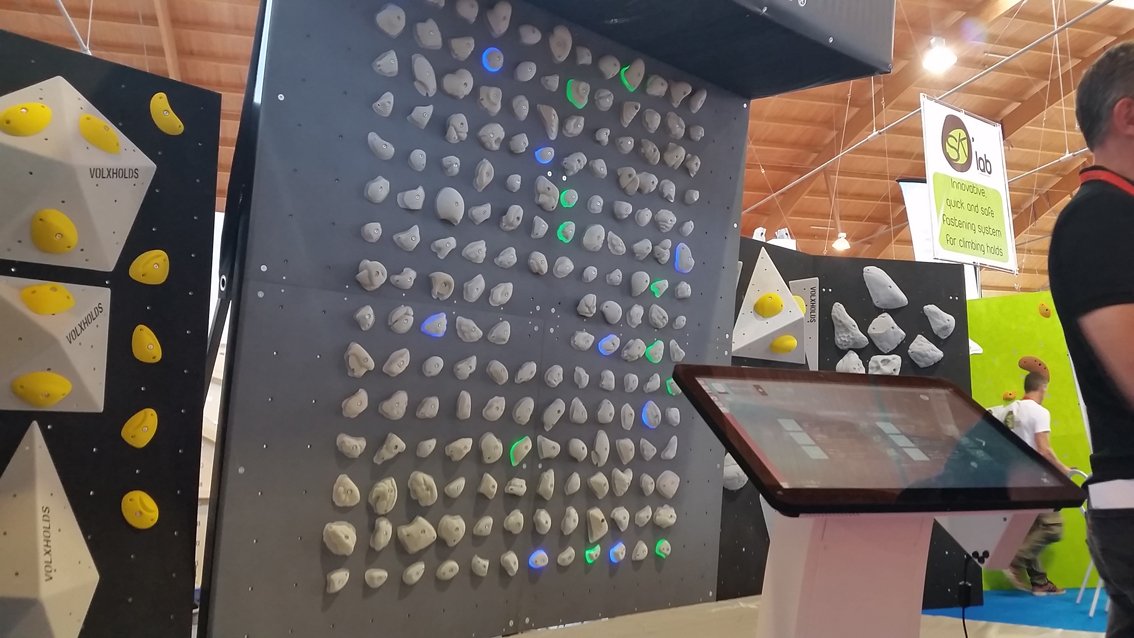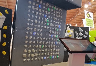 Klettergriffe: Neben neuartigen Formen - die Firma Flame Holds macht sogar Gesichter zu Klettergriffen - bringt Volxholds ein neuartiges Farbensystem. Die grauen Griffe lassen sich über das Tablett ansteuern, so kann jeder z.B. seine Boulderkreation abspeichern und andere können diesen Boulder dann abrufen und klettern.