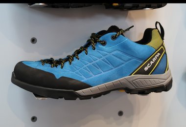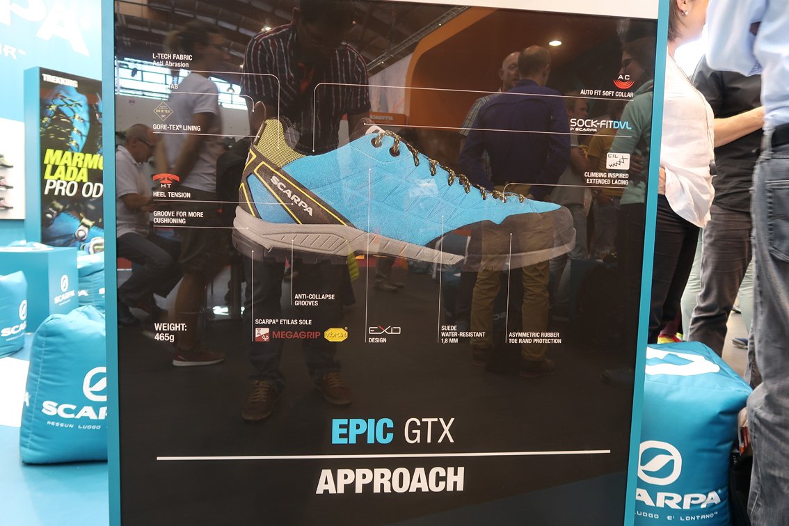 Epic GTX Approach: Scarpa bringt einen leichten (465 g) Zustiegsschuh. Die Schnürung weit nach vorne gezogen, im Vorderfuß einen asymetrischen Schutzgummi und hinten eine spezielle Fersenverstärkung. Der Halbschuh ist bis zu 1,8 mm Wasserdicht und spricht vor allem Kletterer an, die gerne mit leichtem Schuhwerk unterwegs sind.