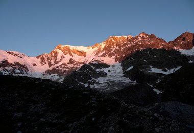 Vor einiger Zeit hörte ich immer wieder von Leuten, die dieses Projekt versuchten und daran gescheitert sind. So wurde mein Interesse geweckt. Nach einigen Recherchen im Internet fand ich heraus, dass es vermutlich bis anhin nur eine Person auch geschafft hat. Ich begann mir zu überlegen, wie ich dieses Projekt angehen würde. Dabei wollte ich nicht nur auf den höchsten Punkt, sondern mit dem Gleitschirm wieder hinunter ins Tal. Auf der Karte sah ich schnell, dass die wohl kürzeste Route über das Marinelli Couloir auf den Gipfel der Dufourspitze (4634m) führt. Ich selber kannte die Route nicht, wusste nur, dass es die längste Couloir-Abfahrt von Europa ist. Am 29. Juni brach ich in Brissago am Ufer des Lago Maggiore auf und fuhr mit dem Rennrad fast 100 Kilometer über Italien nach Macugnaga. Dieser Abschnitt verlief problemlos und ich war viel schneller als gedacht. Nach 3.5 Stunden radeln und einer grosszügigen Pause wechselte ich bereits auf die Bergschuhe und lief in grossen Schritten in Richtung Marinelli Hütte, welche am unteren Ende des Marinelli Couloirs steht. Leider kalkulierte ich mein Trinken zu knapp ein und hatte bereits nach der Hütte keines mehr. Ein fataler Fehler, wie sich später herausstellte.