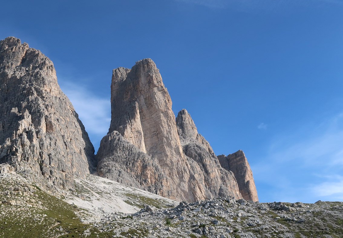 Vittorio Messini: „Nach dem Abbruch an der komplett nassen Nordwand der Großen Zinne wurde spontan entschieden anders weiter zu machen. Wenn wir uns schon die Plagerei angetan haben mit dem Fahrrad zur Auronzo Hütte hinauf zu fahren, dann wollten wir schon mit etwas Kletterei belohnt werden.“