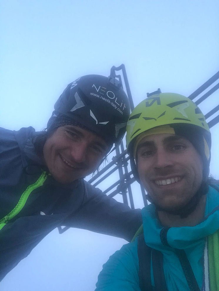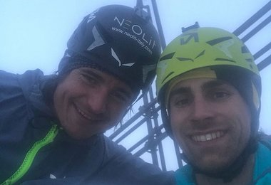 Vittorio Messini: „Die Ortler Nordwand war das gefährlichste der gesamten Tour. Neben den objektiven Gefahren bedrohten auch Sercas die Route. Es hat im Bereich des Flaschenhalses wild geschneit, es hat angefangen kleine Schneerutsche zu geben. Vom Normalweg bekamen wir die Info, dass es immer noch stark schneit aber nicht blitzt. Wir entschieden für eine halbe Stunde weiter zu gehen – wenn es mehr geworden wäre, hätten wir absteigen oder irgendwo warten müssen. Es ist aber etwas weniger geworden und wir haben zügig den Ortler Gipfel erreicht."