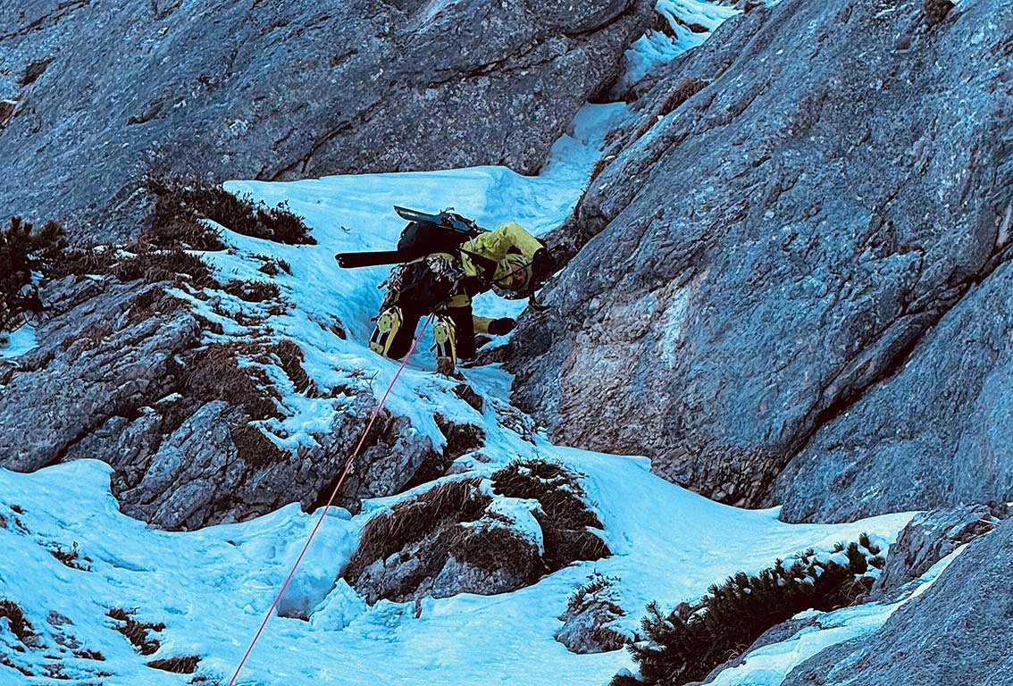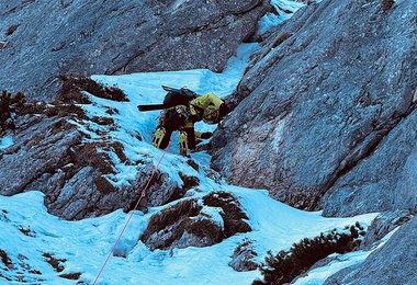 Der erste „Felsvorbau“ war von anspruchsvoller und relativ schwerer Mixed-Kletterei bestimmt. Durch die spärliche Absicherung - es wurden ausschließlich mobile Sicherungsmittel verwendet - und den teilweise blanken Fels, war es ein richtiger „Kaltstart“. Die Absicherung im geschlossenen Göll-Kalk bedarf einiger Kreativität und Erfahrung. Gerade bei den Standplätzen muss man die Augen aufmachen und etwas „basteln“. Rudi hat hier wirklich eine sehr gute Führungsarbeit geleistet. Die erste und dritte Seillänge war in puncto Eisqualität und Gesamtcharakter absolut genial und einzigartig.