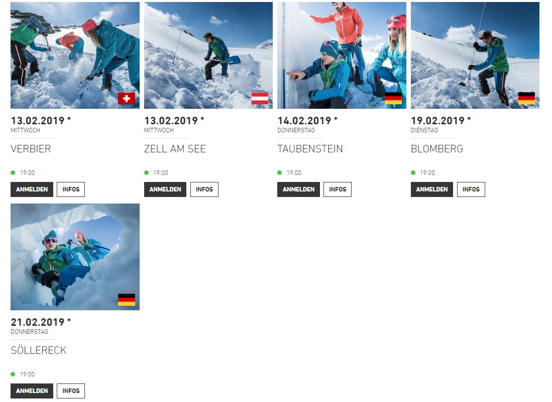 An 13 einschlägig bekannten Nachtskitourengebieten im gesamten Alpenraum bieten wir im Frühjahr 2019 wieder kostenlose Lawinenkompaktkurse an! Darin vermitteln dir professionelle SAFETY ACADEMY Bergführer in 2 Stunden den Umgang mit der Notfallausrüstung und wichtiges Lawinenwissen!