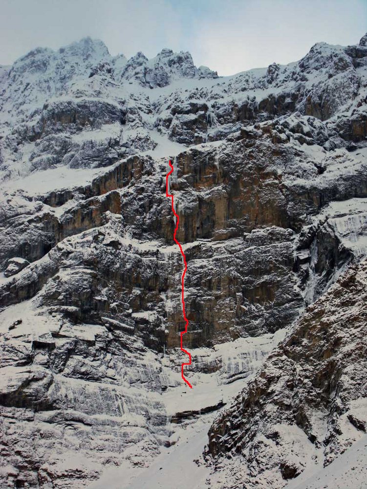 Am 22.10. verbrachten sie 11 Stunden mit dem Einrichten einer neuen Line rechts vom Rocketman, die sie sechs Tage später schließlich frei klettern konnten. Uli meint nur zur zweiten Seillänge (Crux) „ Was ich mit Sicherheit weiss, ist, dass die „Hooks“ sehr schlecht sind, abschüssig. Die ersten Meter gehen ganz gut über das grosse Dach. Spätestens jetzt bin auch ich wach und ich klettere Zug um Zug, Meter um Meter zum nächsten Standplatz. Ich benötige 40 Minuten, um mich in diesem sehr unübersichtlichen Gelände zu orientieren, aber ich komme sturzfrei am Standplatz an. Die erste Hürde ist genommen.“ Übermotiviert klettern die beiden Weiter weiter. „Es gibt keine Seillänge in dieser Route die einfach zu klettern ist. Die 59 Meter lange Eisseillänge mausert sich zum Test für die Psyche. Das Eis ist dünn, sehr dünn sogar und es ist nicht möglich, eine verlässliche Zwischensicherung anzubringen. Um 16.30 sind wir am Ausstieg.