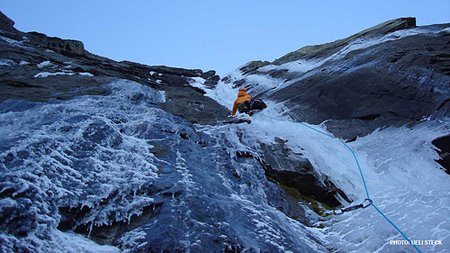 „Die Absicherung fällt spartanisch aus. Das Ziel ist: keine Bohrhaken. Zwei Stunden später befindet sich Simon am Eiszapfen. Endlich, aber wir sind zufrieden. Der Aufwand hat sich gelohnt: eine geniale Seillänge ohne Bohrhaken mit sehr anspruchsvoller Absicherung. Jetzt bin ich dran, es zu versuchen. Die Seillänge muss noch frei geklettert werden.