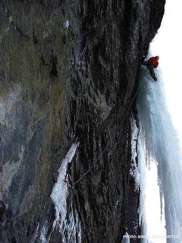 Leicht „steif gefroren“, hänge ich die erste Zwischensicherung ein. Kurz vor einem Normalhaken hat Simon eine Schlinge um einen kleinen Eiszapfen gelegt. Ich habe gesagt, dass alles was ein Sturz nicht auffängt, bremst zumindest das Tempo…"