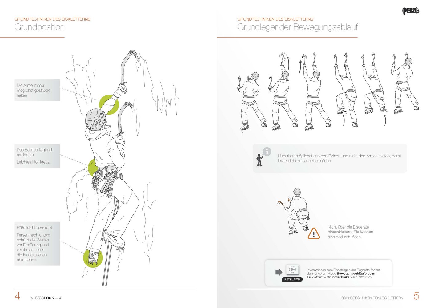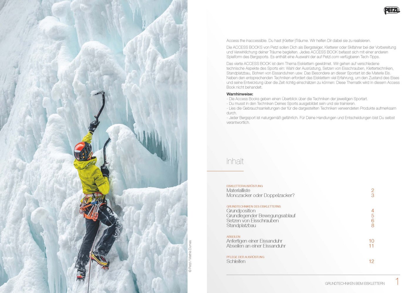 Das vierte ACCESS BOOK ist dem Thema Eisklettern gewidmet. Petzl geht auf verschiedene technische Aspekte des Sports ein: Wahl der Ausrüstung, Setzen von Eisschrauben, Klettertechniken, Standplatzbau, Bohren von Eissanduhren usw. Das Besondere an dieser Sportart ist die Materie Eis. Neben den entsprechenden Techniken erfordert das Eisklettern viel Erfahrung, um den Zustand des Eises und seine Entwicklung über die Zeit richtig einschätzen zu können: Diese Thematik wird in diesem Access Book allerdings nicht behandelt.