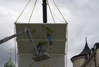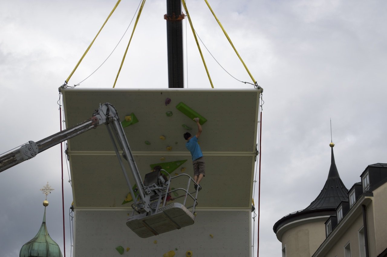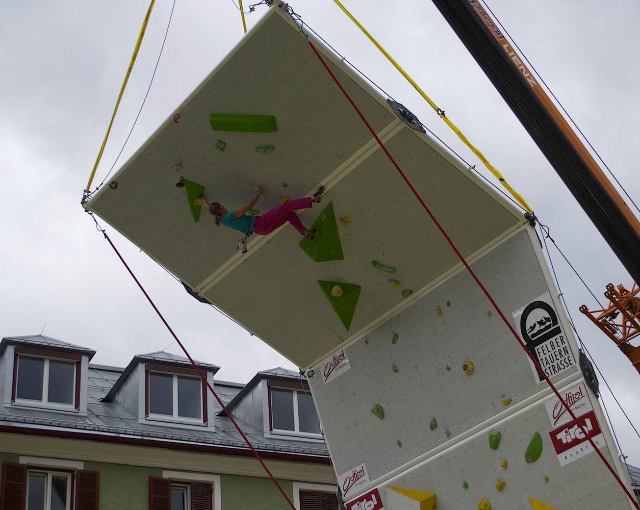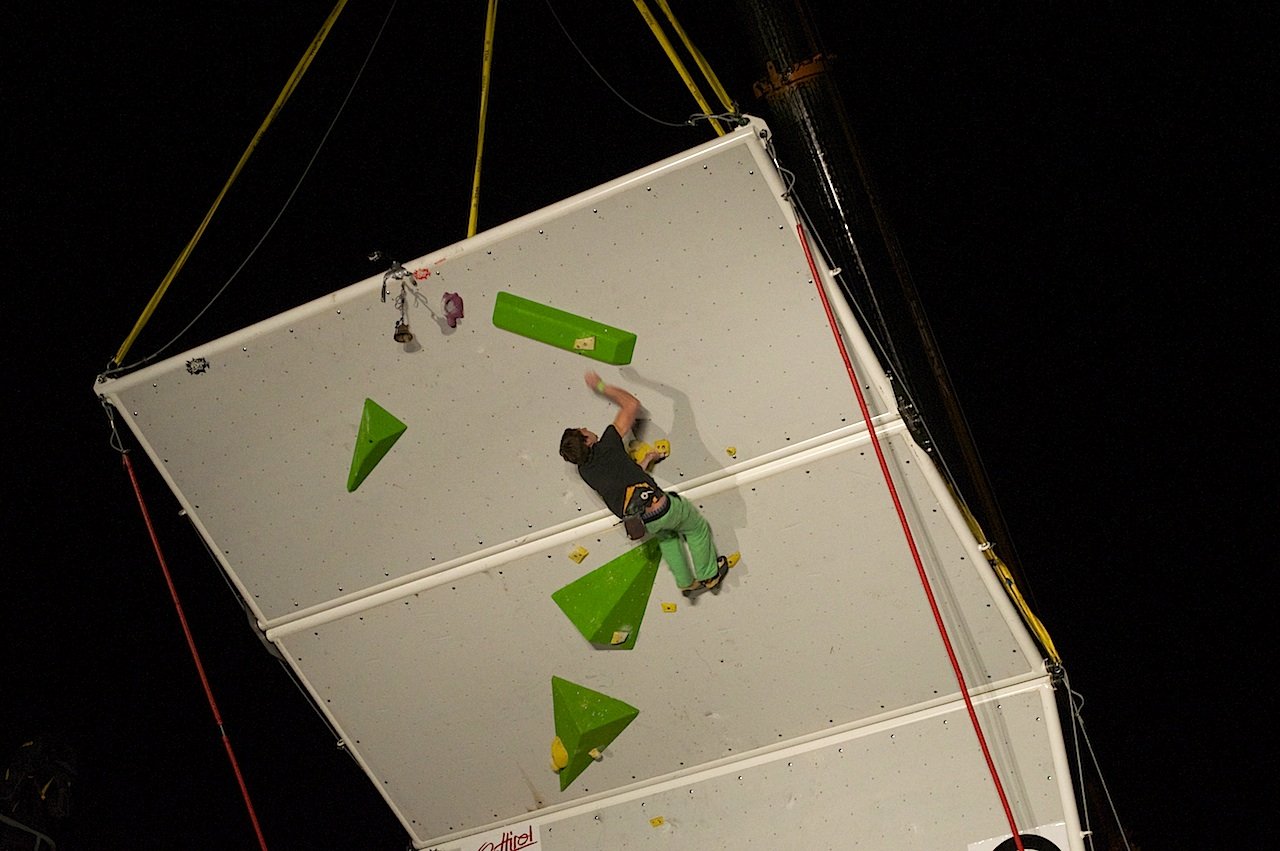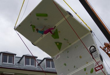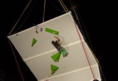Am Freitag fand zunächst ein Trainingsdurchgang auf der 16 Meter hohen und 2,8 Tonnen schweren Kletterwand statt, bei dem die 62 Kletterer ein erstes Feeling für die Wand und den überdimensionierten Airbag erhalten konnten, der ihren Sturz abfing, bevor am Samstag mit dem Wettbewerb gestartet wurde.