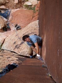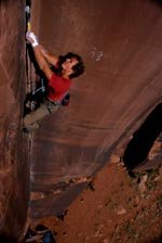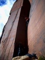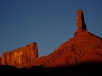 Noch am Abend brechen wir zum „Castle Valley“ auf und fahren den Colorado River etwa eine halbe Stunde nach Süden entlang, und biegen dann nach Osten ab. Was ich dann im Abendlicht zu sehen bekomme, ist atemberaubend. Die tiefe Sonne lässt den Sandsteinkegel mit dem 120 Meter hohen „Castleton Tower“ auf seiner Spitze, vor einem tiefblauen Himmel, in einem glühenden Rot erstrahlen. Das macht natürlich unglaubliche Lust dort hinauf zu klettern. Am darauffolgenden Morgen brechen wir dann auch recht früh auf, um der beträchtlichen Hitze, die hier Anfang Oktober immer noch herrscht, zu entgehen. Wir entscheiden uns für die „Kor - Ingals“ Route. Für den Grad 5.9, so stimmen Rok und ich überein, ist der Weg dennoch sehr anspruchsvoll. Der etwas abgespeckte Sandstein und die breiten Risse lassen ein „lockeres“ Klettern wie im Kalk und bei vergleichbarer Schwierigkeit, nicht zu. Man muss immer konzentriert und aufmerksam sein. Rasch aber haben wir die vier Seillängen hinter uns gebracht und genießen die wundervolle Aussicht. Dieser Trip hat sich wirklich gelohnt, und kann uneingeschränkt weiterempfohlen werden. Vor allem deshalb, weil auch einige weitere Routen lohnend sind.