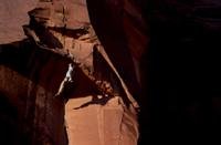 Also klettern eine 5.11+ R route, namens Cobra. Es ist unsere erste Route im Sandstein, und dieses Gestein erweist sich als wesentlich lockerer als erwartet. Man muss sehr genau schauen wo man hingreift und hinsteigt. Zudem bedeckt eine dünne, sandige Schichte die Oberfläche. Die Route gefällt uns aber, und so marschieren wir guter Dinge zu einer Route rechts neben „Ancient Art“. Was der Führer als „nice line“ im Grad 5.10a beschreibt entpuppt sich in Wirklichkeit als eine Route, welche wohl vor Jahren das letzte Mal geklettert worden ist. Unmengen von Sand, losem Gestein und keinerlei Absicherungsmöglichkeit helfen uns bei der Entscheidung, den Rückzug nach der 1. SL anzutreten. O-Ton Rok: „I hope these Fisher Towers will break down one day!“