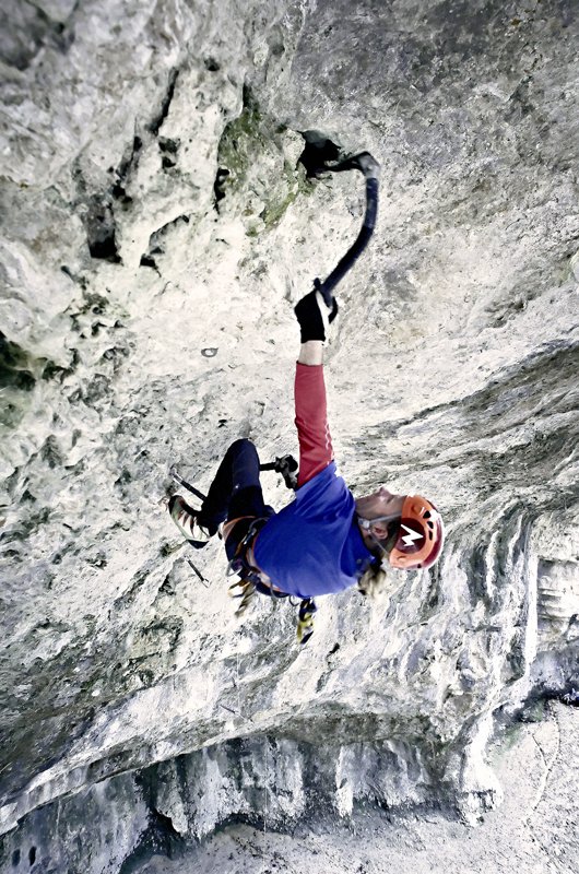 Da die Kälte aber nicht in Sicht war und die persönliche Form stimmte, gelang der Durchstieg dieses 40 Meter langen Ausdauerhammers förmlich zu früh, also noch ohne Eis, im Drytoolingstyle. Für „Ironman“ schlägt Robert Jasper als Bewertung D/M 14+ je nach Eisbildung vor.