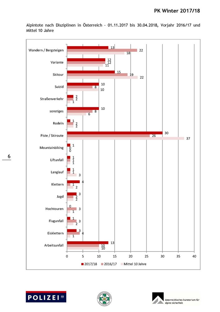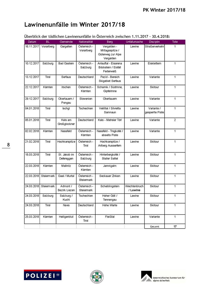 Lawinenunfälle: 17 Tote sind in Österreich durch Lawinen ums Leben gekommen, davon 7 in Tirol, 4 in Kärnten, 3 in Salzburg, 2 Steiermark und ein Toter in Vorarlberg. Die Verteilung der Lawinenopfer nach Disziplin war wie folgt: 8 Skitour, 7 Variante und je ein Opfer beim Eisklettern und im Straßenverkehr (Güterweg).