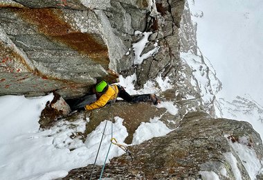 Die erste Winterbegehung sicherten sich David Lama, Hansjörg Auer und Peter Ortner im März 2013. Bei -22 Grad beschrieben die drei das Abenteuer als eine ihrer härtesten Unternehmungen bisher. Martin Feistl und Amelie Kühne versuchten die Tour im März 2022 mit Direkt- bzw. Originaleinstieg, mussten jedoch am zweiten Tag abbrechen. Martin Feistl mobilisierte im letzten Jahr Simon und mich für einen weiteren Versuch des Schiefen Risses.
