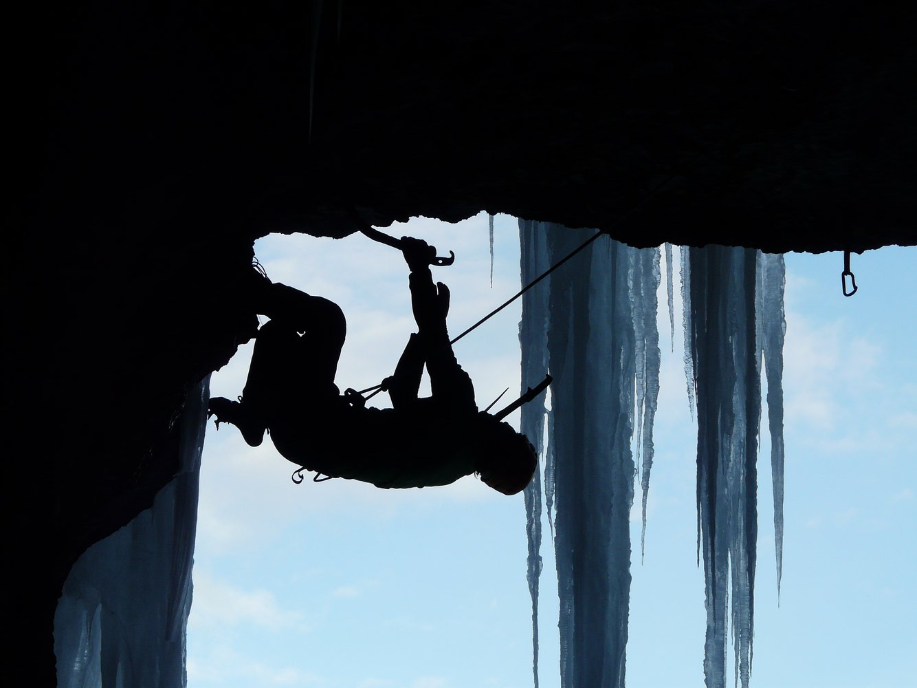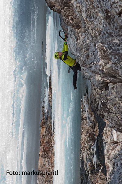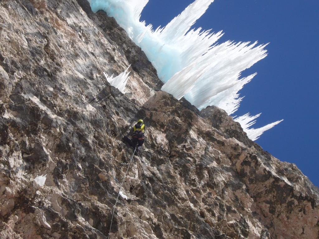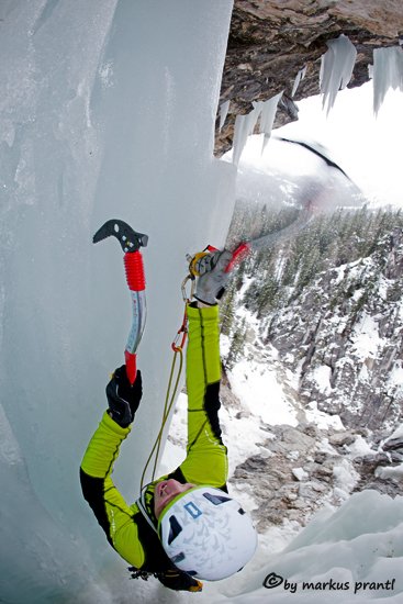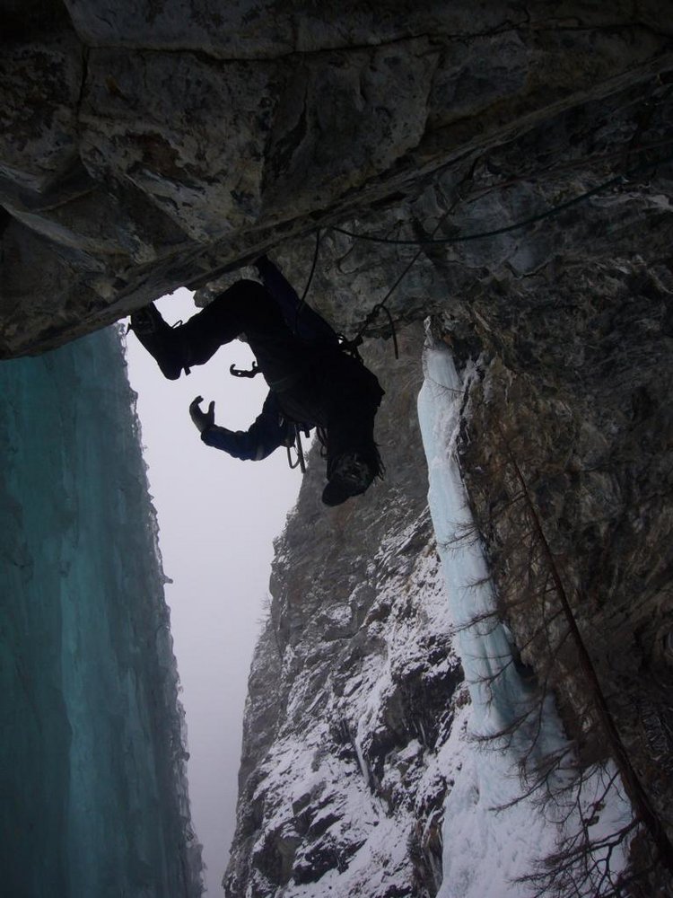 Die Tour ist eine Kombination aus athletischem, sehr überhängigem Mixedklettern und alpinem Eisklettern. Es war schon März, die Temperatur lag bei 12 Grad und ich war mir nicht sicher, ob es möglich sei, auf dem riesigen Eisvorhang in der prallen Sonne hinaufzusteigen. Ich startete daher gleich nach Sonnenaufgang. Obwohl die ersten zwei Seillängen schwierig waren kam ich gut voran. Bei der Dritten musste ich durch freistehende Eisvorhänge mit gefährlichen Querrissen klettern. Ich musste die geplante Routenführung verlassen und über eine andere Eiskante des Eisüberhangs klettern. Der von mir gewählte Weg war sehr weit von den vorhandenen Sicherungen entfernt und ich hatte Angst, die Kletterei ungesichert fortzusetzen. An der Überhangkante ließ ich meinen Körper auspendeln und konnte ihn nur mit letzter Kraft stabilisieren.