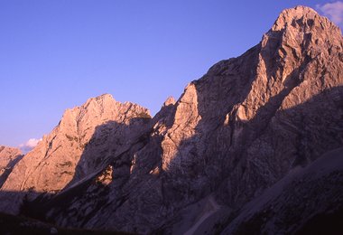 Mit dem Genuss eines herrlichen Weitblickes im Abendrot weicht dann endlich die Anspannung des ausgefüllten Klettertages. Bestätigt durch die Gewissheit die auf Grund der Gesamtanforderung schwierigste und vielleicht auch schönste Nordwandroute hinter sich gebracht zu haben, ist der Abstieg über den Normalweg dann nur noch halb so schlimm.