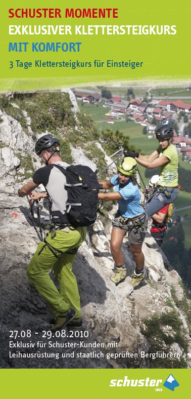 Vom 27.08.- 29.08.2010 bietet das Sporthaus Schuster exklusiv für seine Kunden einen Klettersteigkurs mit Komfort an. Die Teilnehmer erhalten eine Leihausrüstung und werden von einem staatlich geprüften Bergführer eingewiesen und begleitet.