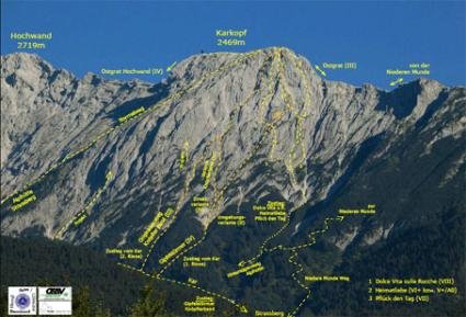 Die beiden Tiroler Kletterer Markus Praxmarer und Bernhard Hangl konnten ihre „Sechsologie am Karkopf“ (alle 6 Routen am Karkopf - Mieminger Gebirge an einem Tag durchsteigen) am 17.06.05 erfolgreich durchführen.