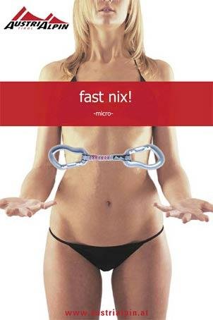 Beim MICRO-Sujet hat die Dame auch „fast nix“ an und das Express-Set ist ein echtes Leichtgewicht (85g), denn jedes Gramm zählt ja bekanntlich beim Sportklettern. Aber auch bei Alpinen-Sportklettereien macht sich die Gewichtsersparnis bemerkbar (10 Express-Schlingen unter 1 KILO!). Außerdem bieten die MICROS eine angenehm große Schnapperöffnug (21mm), in die sich bequem ein Zwillingseil einhängen lässt.