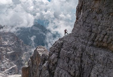 Kurzentschlossen geht die Tour also weiter, über den Normalweg zum Fuß der Großen Zinne, über den Paternsattel zur Drei-Zinnen-Hütte und zum Talschluss in Sexten, wo – nach weiteren 10,5 Kilometern sowie 2 Stunden und 56 Minuten, Freunde bereits mit einem herzlichen Empfang auf die beiden Extremsportler warten. Insgesamt waren es somit knapp 30 Kilometer Strecke, rund 4.700 Höhenmeter im Auf- und Abstieg, sowie 75 Seillängen bis zum 7. Schwierigkeitsgrad.