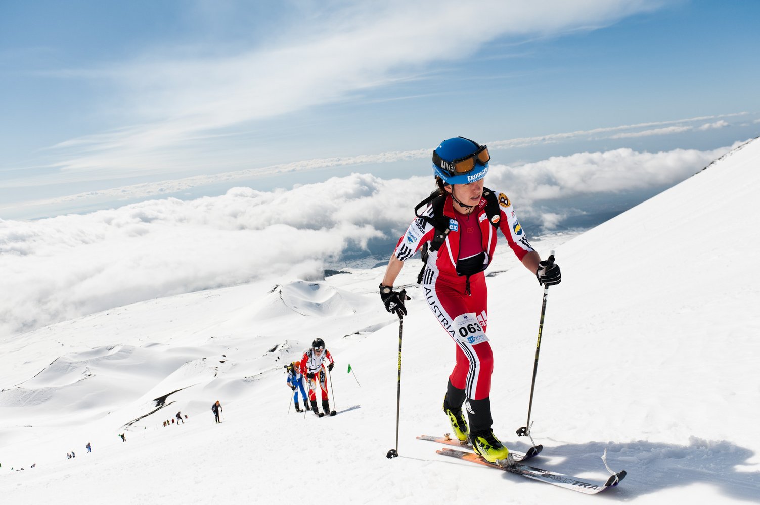 Noch vor kurzem machte der Ätna durch massives Feuerspucken auf sich aufmerksam, heute hingegen stahlen die Wettkampf-Skibergsteiger dem Vulkan die Schau, als sie mit Höllentempo über das schneebedeckte Lavagestein die Hänge in Richtung Krater hinauf liefen.