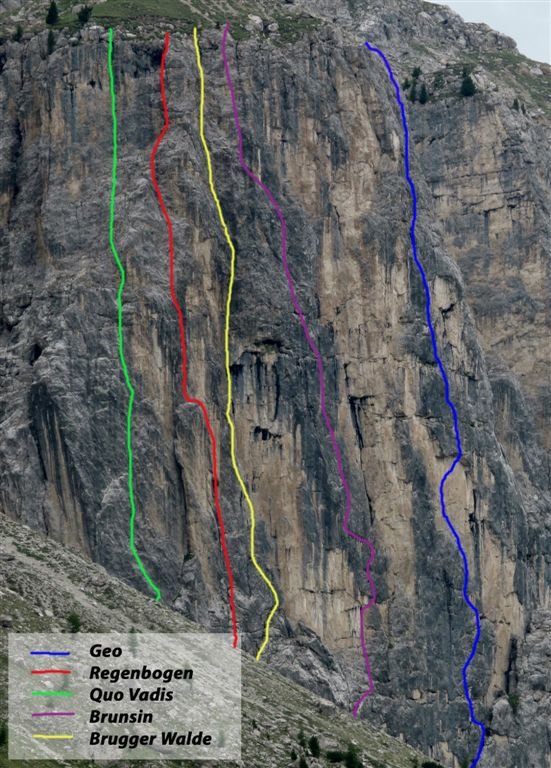 Nachdem Manfred über den steilen Weg zum Wandfuß hinunterläuft, steigt er nun gleich wieder ein; dieses Mal in der Route "Regenbogen", ebenfalls im VII Schwierigkeitsgrad. Bald ist er wieder am Gipfel und rennt erneut zum Wandfuß um in die Route "Quo Vadis" (wieder VII Grad) einzusteigen. Diese beiden Routen weisen äußerst heikle Schlüsselstellen mit extrem kleinen Griffen auf und wurden bisher nur von Stuffer selbst im Alleingang, also ohne jegliche Sicherung, begangen.