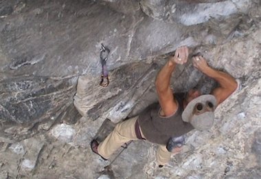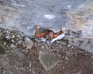 Kurze Zeit später war ich genau an dieser Stelle, der erste Teil lief optimal, kalt, guter Gripp, jetzt gilts. Links die kleine Leiste auf Schulter, rechter Fuß auf die abschüssige Leiste, unter mir Luft, viel Luft, da die Route 15m überhängt. Schlüsselzug, 2 Sekunden lang gespannt sein wie eine Feder, rechte Hand zum Seitgriff, ansteigen, jawohl, konzentrieren, noch 10m, jes. Psychisch meine härteste Route, Schwierigkeitsgrad Nebensache!!