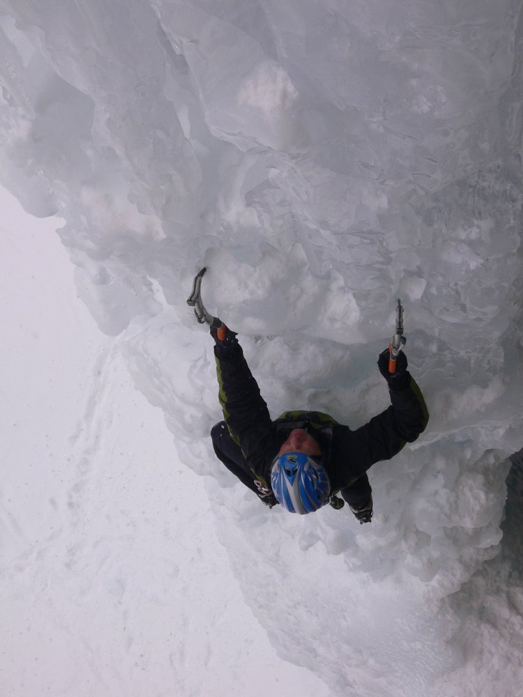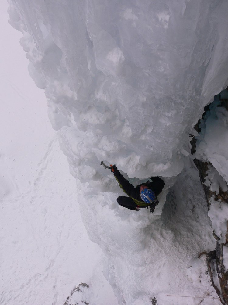 Die "Kerze" W5+ im Pinnistal ist sicher das Schauspiel für die Eiskletterer und für die Zuschauer auf der Pinnisalm. Nachdem ich mit meinem Kletterfreund Christoph Aster aus Mittenwald (mit dem Christoph war ich im August am Mustagh Ata 7545m in China) die Kerze nach oben geklettert bin, blieb Christoph oben und ich seilte allein ab, um die "Kerze" free solo zu klettern.