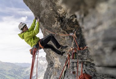 Hochalpine Fels/Sportkletterroute in sehr gutem Eigerfels! Alle nötigen Schlag/ Bohrhaken wurden belassen, 1 Satz Camalots 01-2 zur mobilen Absicherung empfehlenswert, 50 Meter Seile, Abstieg über Westflanke!