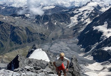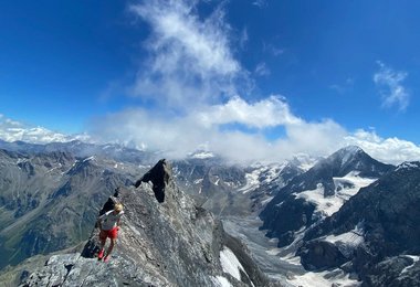 So fuhr ich am 21.08. wieder nach Sulden, gestartet bin ich dann erst um 11.00 Uhr um andere Seilschaften zu vermeiden. Schon kurz nach dem Start machte mir aber die Hitze zu schaffen und es ging nicht ganz so leicht wie erhofft. Auf der Hintergrathütte war ich nach 35 Minuten. Anschließend ging es in das ewig lange Schotterfeld, das dann zum eigentlichen Grat hinauf führt. Der lose Weg machte das ganze dann auch nicht leichter und kostete extrem viel Kraft. Irgendwann nahm es dann doch endlich ein Ende und nach 1h 17' erreichte ich endlich das erste Firnfeld. Es war schon ziemlich tief und nass, aber immerhin kühlte es etwas und so ging es in den letzten Teil der Tour. Hier oben war es endlich viel angenehmer und die leichte Kletterei machte dann trotz aller Anstrengung auch wieder Spaß.