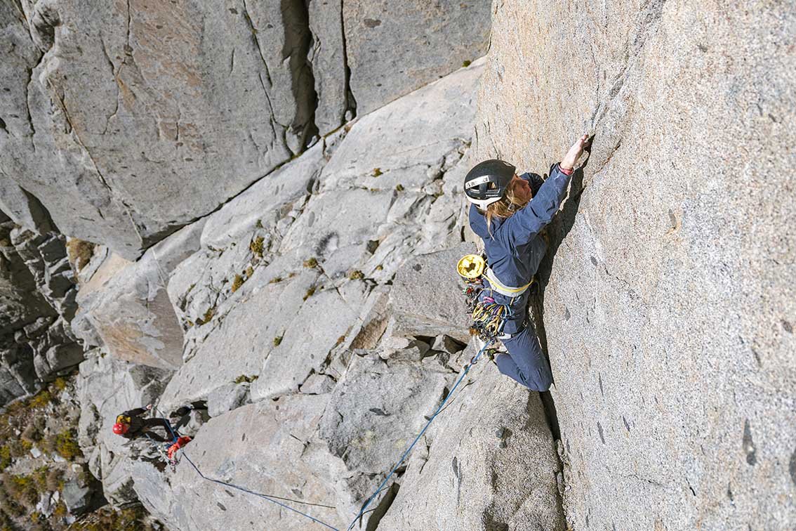 „Was Helixir so besonders macht, ist ihr außergewöhnlich elastisches Gewebe. Wenn du dich nach dem nächsten Griff streckst, bewegt sich die Shell mit dir und sorgt dafür, dass dich nichts auf dem Weg zum Gipfel zurückhält. Wir wissen, wie essenziell wichtig flüssige Bewegungen beim alpinen Klettern sind. Aus diesem Grund ist jede Naht, jedes Paneel strategisch platziert und dient einzig dem Zweck der uneingeschränkten Bewegungsfreiheit.