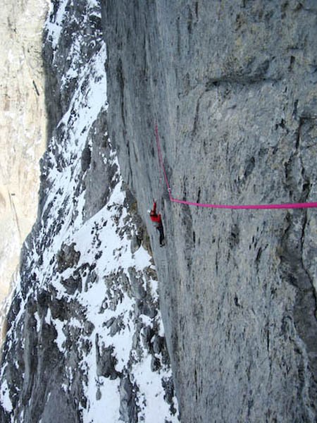 Ihre Geduld (Paciencia) und Hartnäckigkeit haben sich am Ende aber ausgezahlt. Obwohl in den Letzten Seillängen noch frischer Schnee lag, blieb die Wand am Freitag den 29.08, dank einer Bisenlage trocken. Sie stiegen um neun in die erste Seillänge ein und genau 12 Std. später lagen 16 Seillängen hinter ihnen. Nach einer recht angenehmen Nacht folgten am nächsten Tag die noch fehlenden sieben Seillängen. Zwischen und teilweise auf den Schneeflecken konnten sie auch diese noch hinter sich bringen. Um 13.00 Uhr waren sie auf dem Tschechenpfeiler. Nun folgte der Abstieg- ein „Rennen“ über die Westflanke zum Zug im Eigergletscher. Diser brachte Stephan noch rechtzeitig zu einem High-line Engagement in Thun und Ueli in seinen wohlverdienten Sportkletterurlaub.